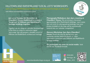 Join us on Tuesday 4th November at Chandlers’ House, Rathfriland to create a ‘Local List’ of Hilltown and Rathfriland‘s heritage buildings together. Together we are using our specially developed app: In Your Area to create an interactive digital ‘story-map’ that will present a detailed record of Hilltown and Rathfriland’s architectural heritage. There are lots of ways to participate and have your say, this is a free event, book by e-mailing [email protected] or call or text 07540866986.
